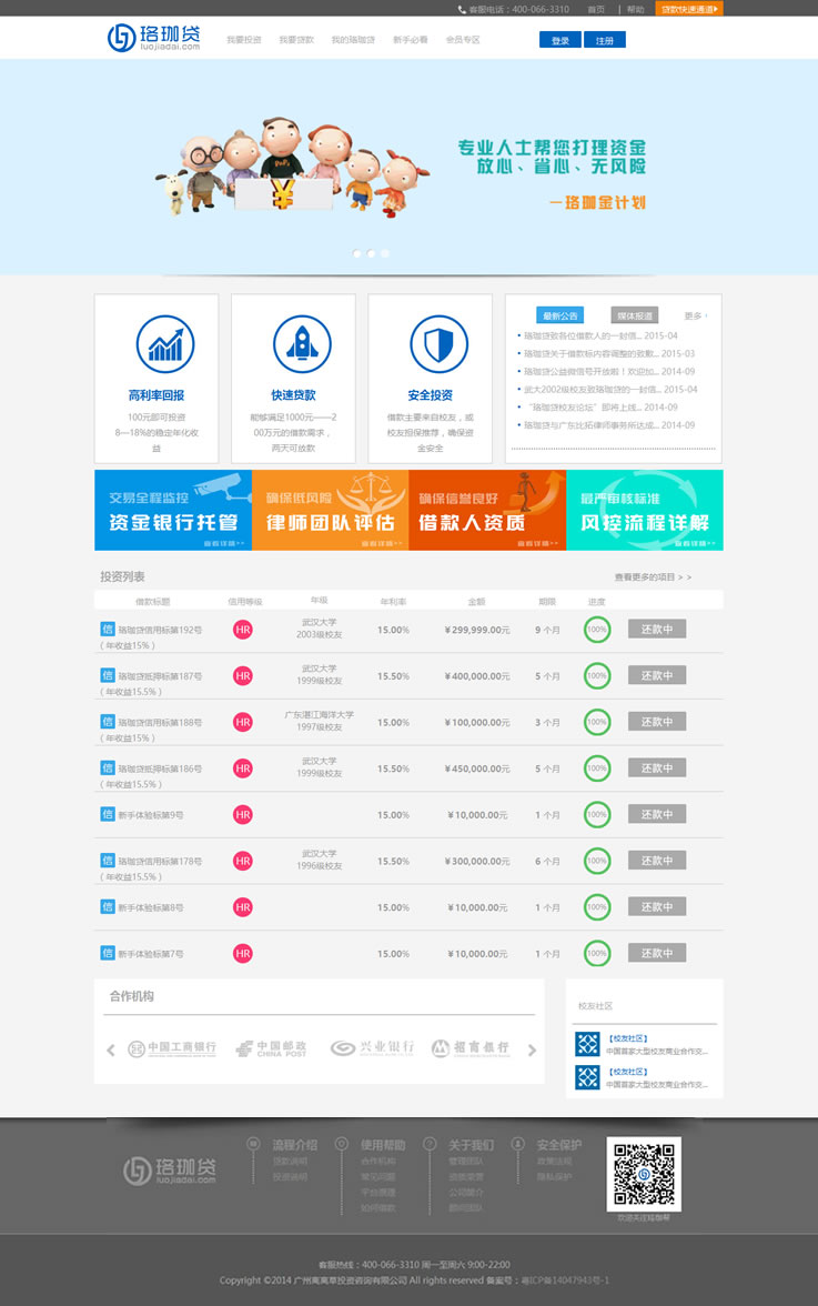珞珈貸是由30余名武漢大學(xué)校友發(fā)起的校友社交金融平臺,運(yùn)營法律主體為廣州離離草投資咨詢有限公司,公司注冊資本金500萬元人民幣。我們立志將珞珈貸打造成為全球武漢大學(xué)校友的核心投融資平臺,滿足校友的投融資需求,為校友提供最為安全、權(quán)威、高效的投融資服務(wù)。珞珈貸同時面向全體社會投資者,提供安全高效的投資渠道。我們專注于為有資金需求和投資需求的校友搭建一個公平、透明、穩(wěn)定、高效的校友互助金融平臺。