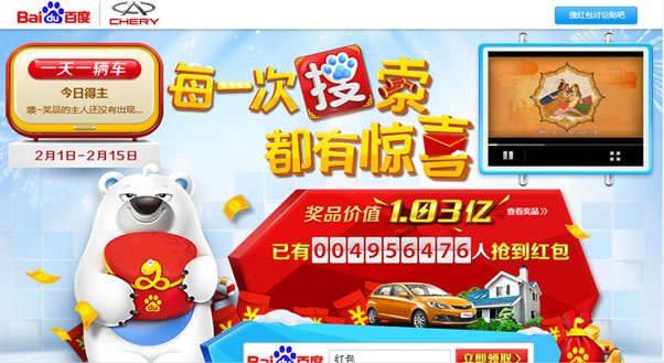 看看上圖,CHERY的標(biāo)志很明顯吧?據(jù)悉,百度的獎(jiǎng)品里就有CHERY的汽車(chē)喔!當(dāng)然,要參加搜索才能積累拿紅包的分值,用戶還可以通過(guò)下載百度的瀏覽器、百度搜索入口以及百度語(yǔ)音助手來(lái)參加搜索,手機(jī)搜紅包,不但沒(méi)有次數(shù)限制,中獎(jiǎng)概率也倍增,看來(lái)百度對(duì)于移動(dòng)手機(jī)市場(chǎng)的搜索份額占有也是志在必得呢!