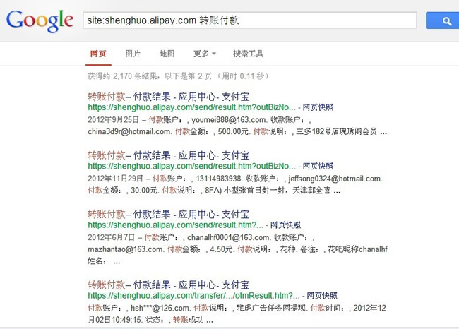 根據(jù)騰訊新聞昨日22:34分信息,支付寶被爆用戶的付款轉(zhuǎn)賬信息被谷歌抓取,大量的用戶隱私被泄露。筆者今天早上上班看到此文,在上午10時(shí)左右親身試驗(yàn)了一下,在谷歌中搜索“付款轉(zhuǎn)賬”“支付寶轉(zhuǎn)賬”相關(guān)關(guān)鍵詞時(shí)并沒有出現(xiàn)文中所述的信息,但當(dāng)筆者使用SEO常用命令“site:shenghuo.alipay.com(支付寶應(yīng)用中心頁面)+付款轉(zhuǎn)賬”搜索時(shí),果然搜索出2170條結(jié)果,如下圖: