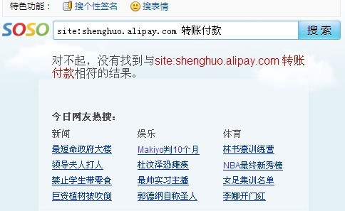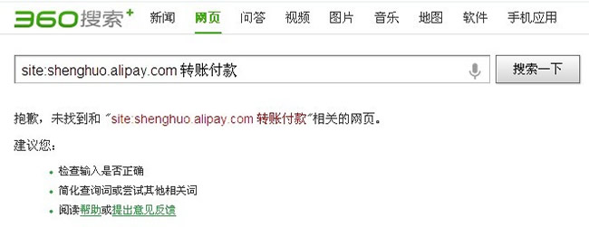 “site:shenghuo.alipay.com付款轉(zhuǎn)賬”等相關(guān)關(guān)鍵詞在百度、360綜合搜索、SOSO搜索來進(jìn)行驗(yàn)證,結(jié)果發(fā)現(xiàn),百度搜索對(duì)所有關(guān)鍵詞的搜索都會(huì)得出數(shù)量不多的相關(guān)項(xiàng)目,但是并沒有出現(xiàn)類似谷歌搜索中用戶轉(zhuǎn)賬支付信息,而360綜合搜索與SOSO搜索對(duì)于中文文字關(guān)鍵詞搜索也得出了一部分的搜索相關(guān)項(xiàng),但在使用“site:shenghuo.alipay.com付款轉(zhuǎn)賬”搜索時(shí)卻沒有任何結(jié)果。如下圖: