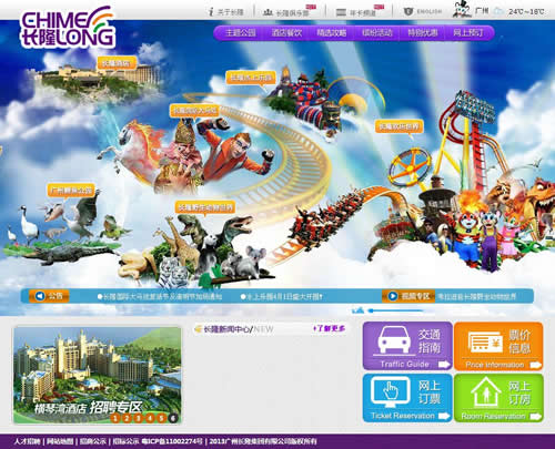 在展示方式上面,我們可以參考一些比較大型的旅游景點或度假村的展示方式。如著名的廣州長隆歡樂世界,其首頁就使用了大型的動畫設計,用栩栩如生的動畫來作為每個景點的導航,輔以明快的色調(diào)搭配以及特效設計,不但整體展現(xiàn)上很吸引人,而且一目了然的設計也讓瀏覽者能夠快速查找到目標欄目及信息。